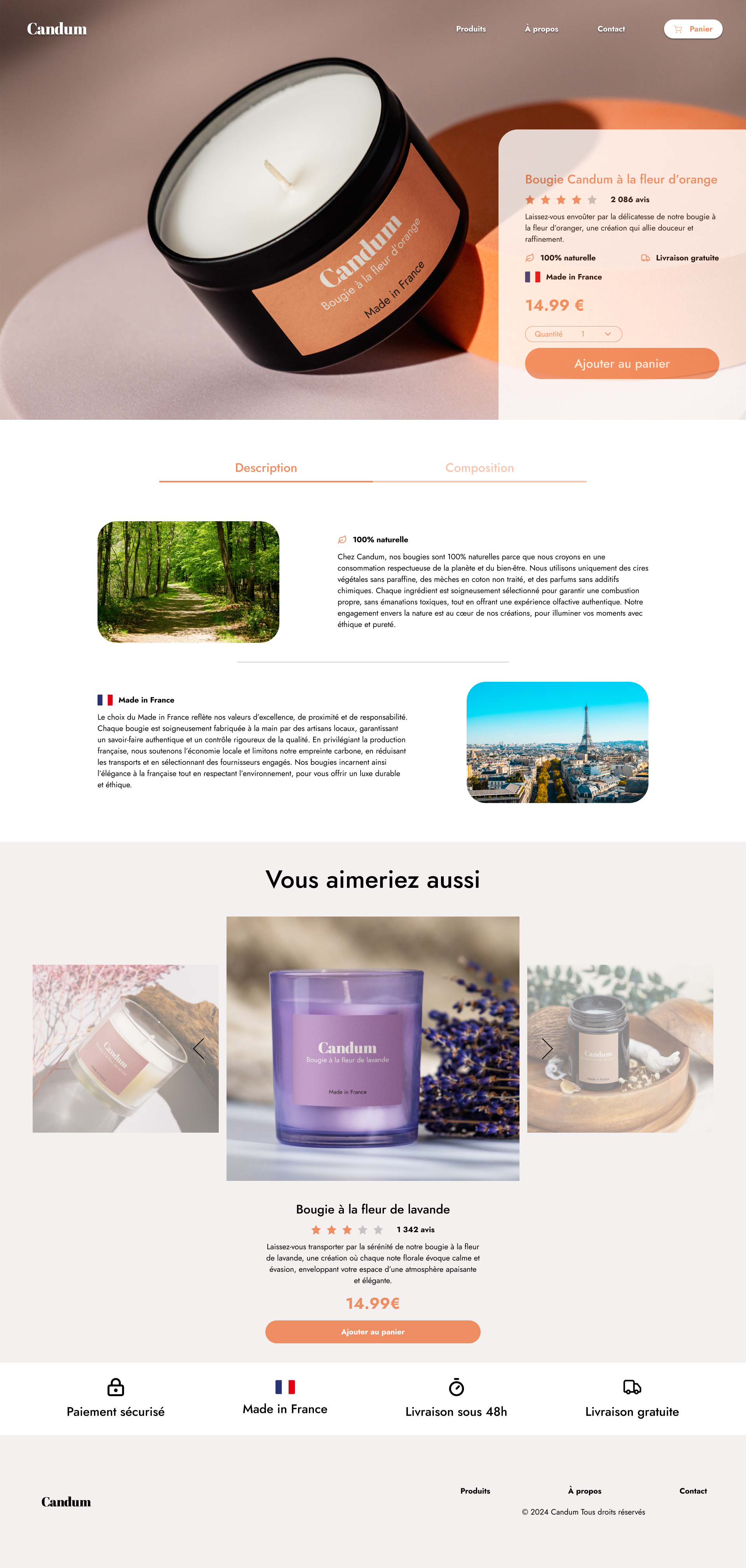 Dans le cadre d’une ressource en design UX/UI durant ma deuxième année de BUT MMI, j’ai réalisé une maquette de page produit. Pour ce projet, j’ai imaginé une marque fictive de bougies nommée Candum, pour laquelle j’ai conçu une identité visuelle complète ainsi qu’une interface de vente cohérente et optimisée.